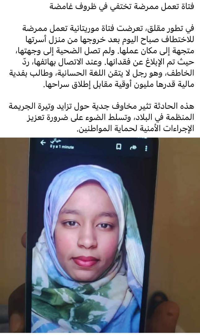 بعد الإعلان يوم أمس الجمعة 2025/03/21 عن اختفاء القابلة المتدربة لاله عيشه خين عبد الله، مولوة بتاريخ 10 مايو 2005 عرفات، من منزل أهلها في مقاطعة عرفات بولاية انواكشوط الجنوبية في ظروف غامضة، وبعد عمليات بحث وتتبع للمعنية، تمكنت الشرطة الوطنية من توقيفها مساء اليوم السبت 2025/03/22 في مقاطعة باسكنو بولاية الحوض الشرقي وهي في طريقها إلى خارج الوطن بمحض إرادتها، ولايزال البحث متواصلا مع المعنية لمعرفة ملابسات القضية.